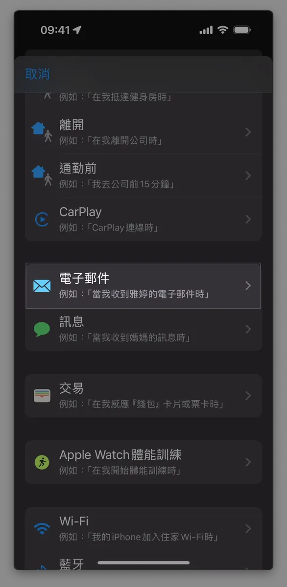 自動執行條件的部分目前只限 iOS 自身或自家的 App,例如:特定時間、抵達、離開某個位置、感應到 NFC、收到訊息、電子郵件或連接上 Wi-Fi、電池電量、勿擾模式、偵測到聲音…等等