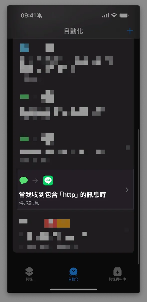 2.切換到「自動化」頁籤,選擇右上角「+」,下滑找到「訊息」