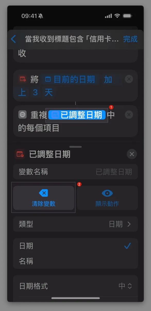 重複「已調整日期」中的每個項目的「已調整日期」輸入匡,選擇「清除變數」 - 清除後,選擇