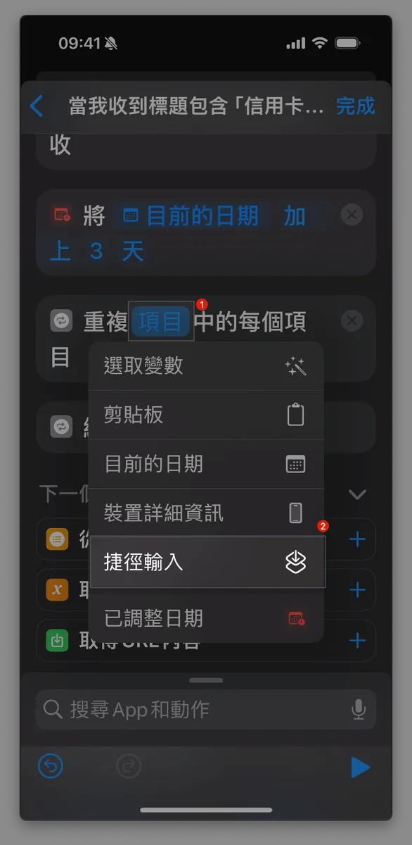 信用卡帳單多個關鍵字要個別建立多個捷徑。 - 「確認後執行」改成