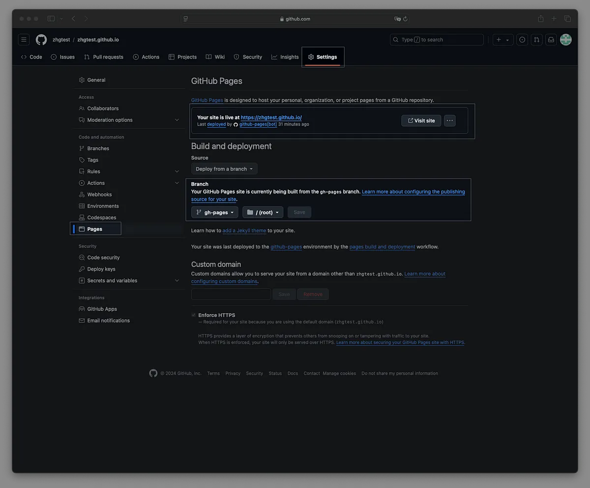 步驟 5. 前往 Settings -> Pages,確認 GitHub Pages 的分支設定為「gh-pages」: