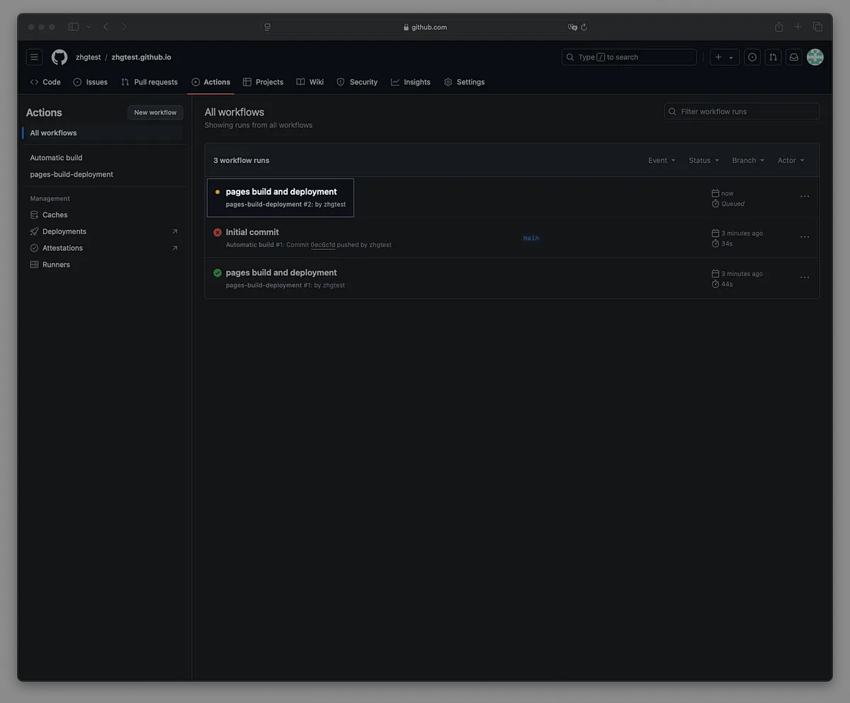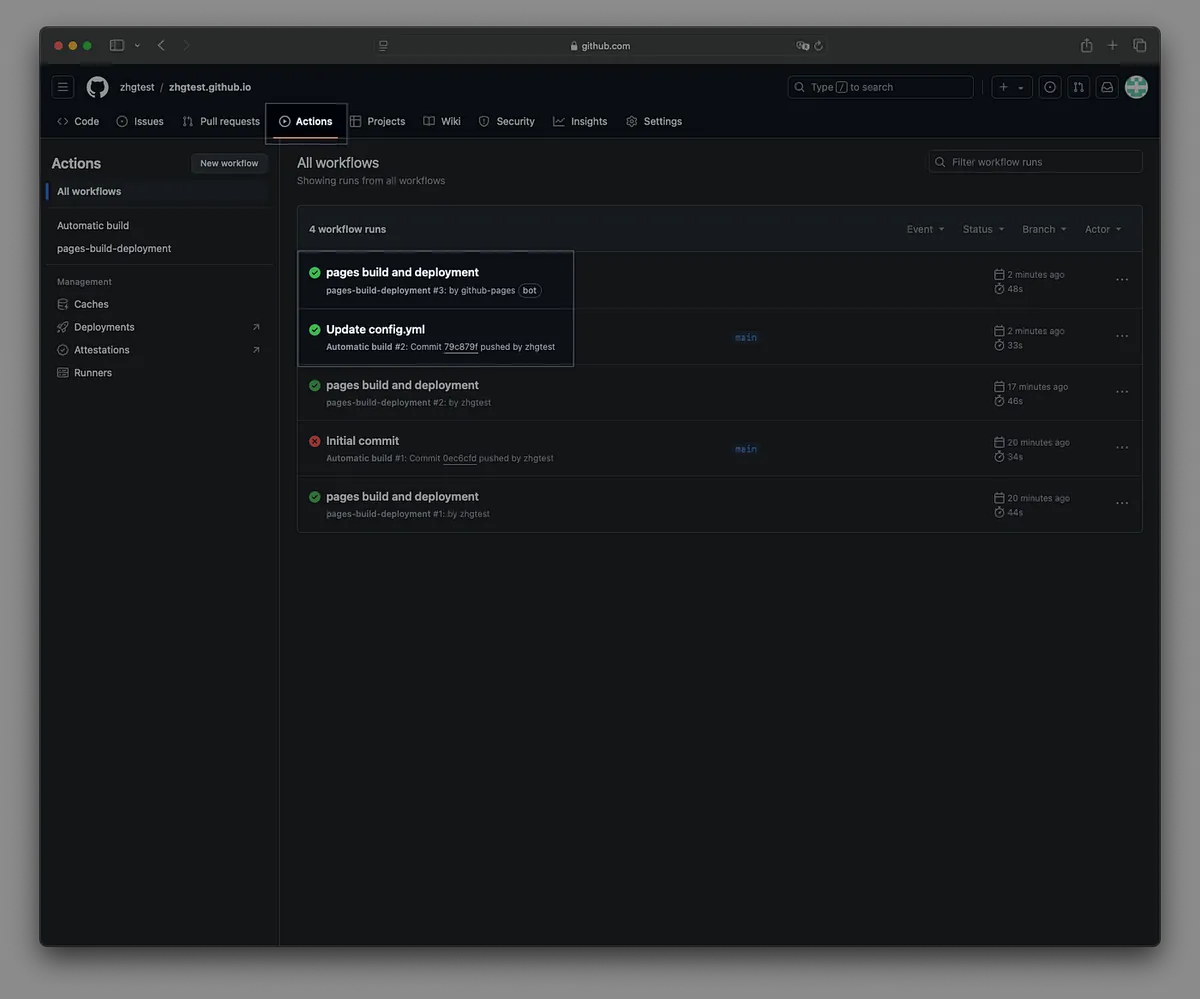 請注意,每次修改文件後,您需要等待 GitHub Actions 完成自動建置和頁面建置與部署任務。