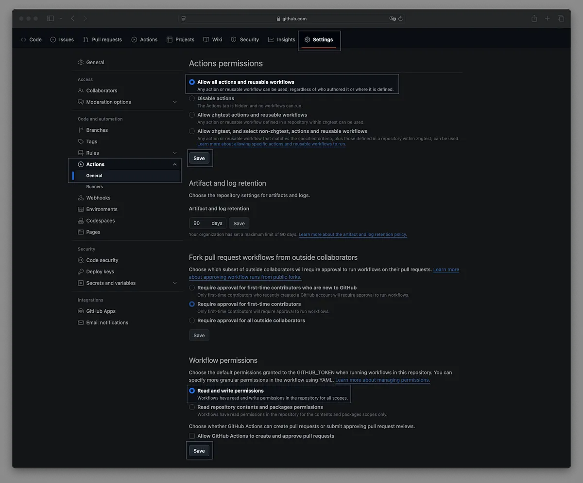 步驟 4. 前往 Settings -> Actions -> General,確保選擇以下選項: