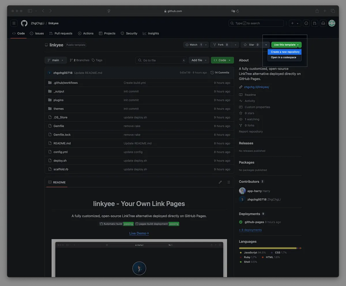 步驟 1. 點擊 linkyee 範本庫右上角的「Use this template」按鈕 ->「Create a new repository」: