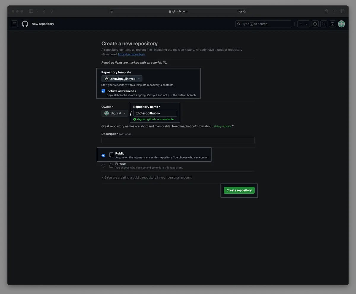 步驟 2. 勾選「Include all branches」,輸入您想要的 GitHub Pages 倉庫名稱,完成後點擊「Create repository」: