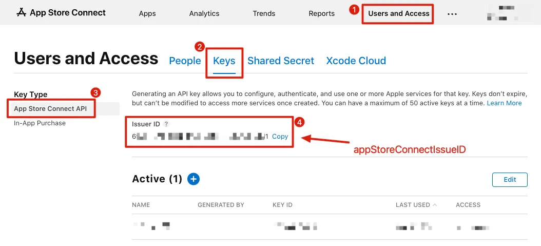 - App Store Connect -> Keys -> App Store Connect API