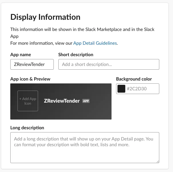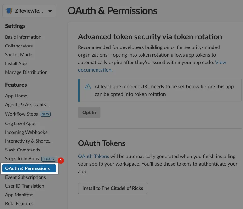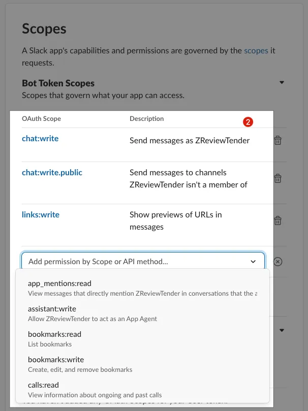 - 依序輸入新增 ZReviewTender Slack App 必備的三個 Scopes: