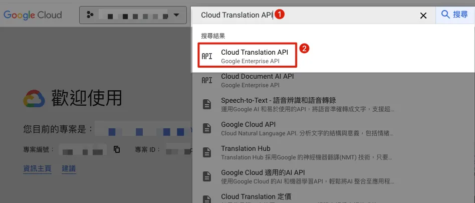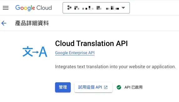 - 請先確定 Step 2. 建立的 Service Account 所屬 GCP Project 有啟用「Cloud Translation API」