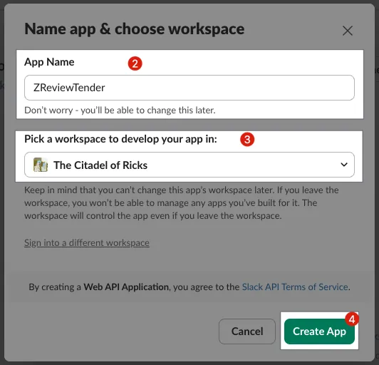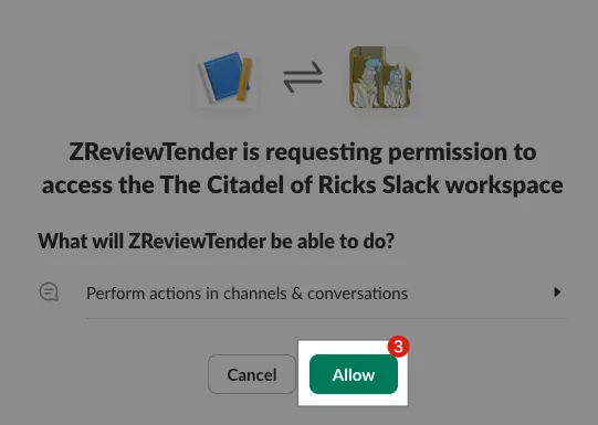ZReviewTender或自定義 Slack App 名稱 - 選擇目標安裝的 Slack Workspace:請確認你選擇的 Workspace,你有新增 Slack App 的權限。