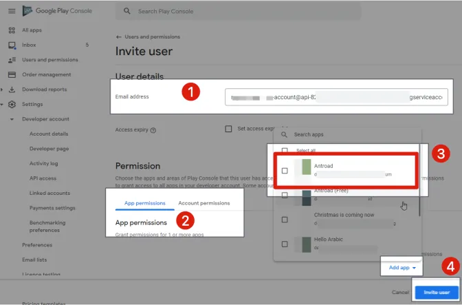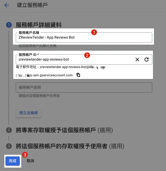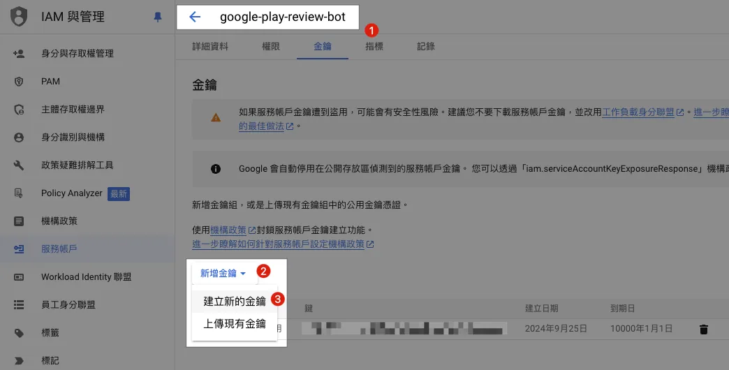 Android 較為複雜,需要先從 App 專案所屬的 Google Cloud Project 啟用 API & 建立 Service Account (服務帳戶) & 將服務帳戶加入 Google Play Console 並賦予 App 權限。