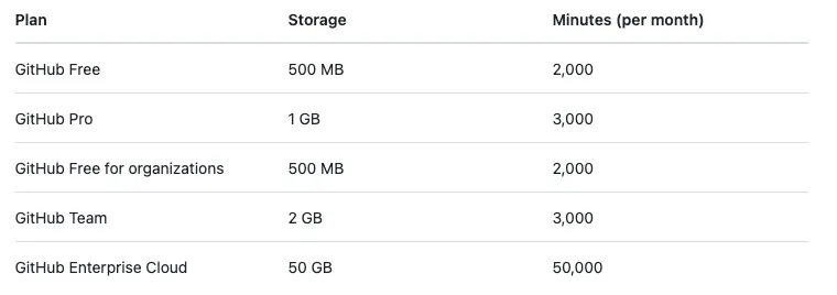 GitHub Free 提供基本 500 MB Storage (for CI/CD Artifact)、2,000 Minutes 一個月執行分鐘數。