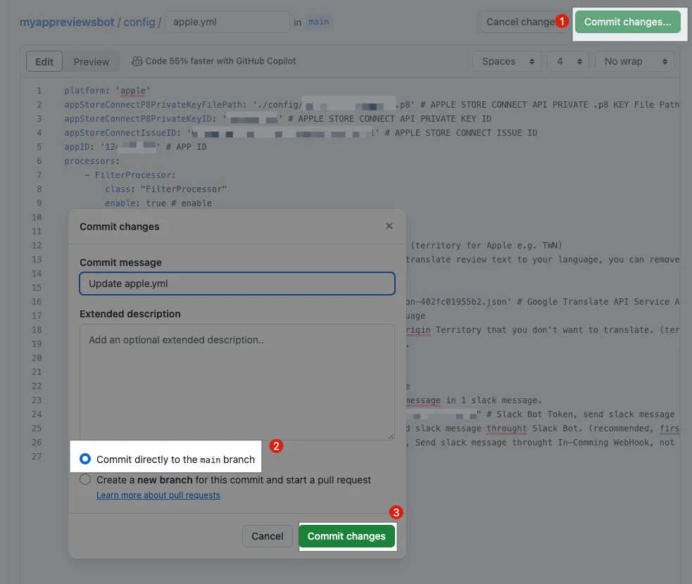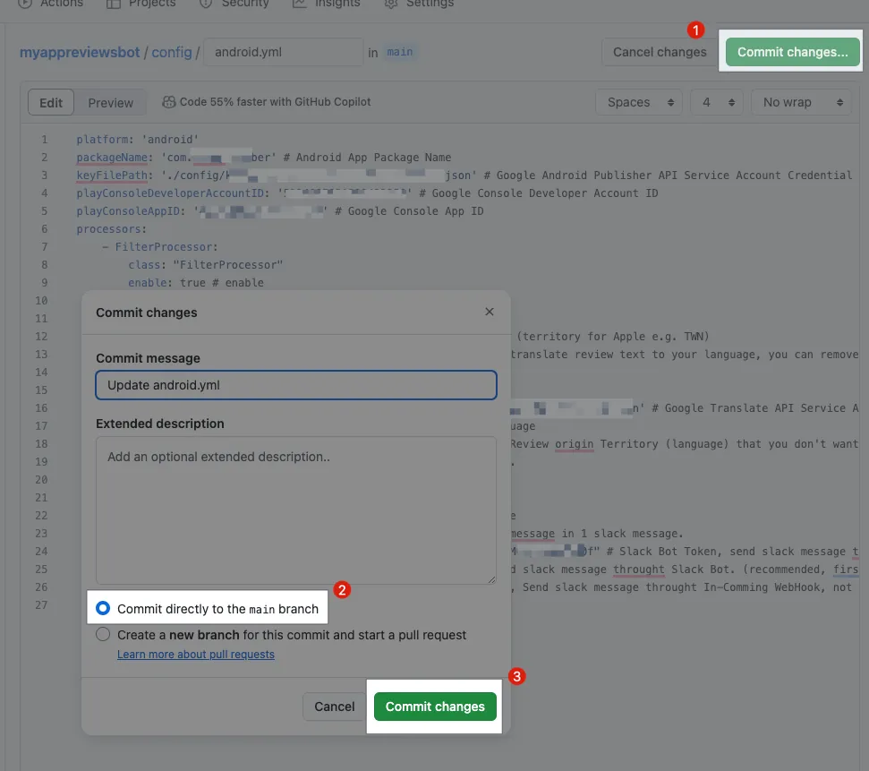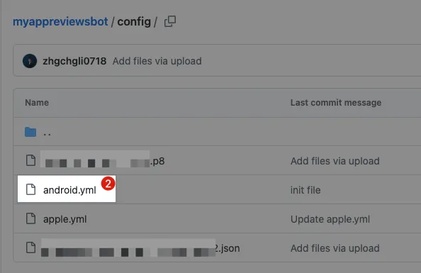 packageName: Step 2. Google Play Console 後台記下來的Package NamekeyFilePath: 輸入./config/XXXX-XXXX.json(Step 2. GCP IAM 保存下來的XXXX-XXXX.jsonService Account 金鑰檔案名稱)playConsoleDeveloperAccountID: Step 2. Google Play Console 後台記下來的Developer IDplayConsoleAppID: Step 2. Google Play Console 後台記下來的App IDslackBotToken: 輸入 Step 1. 記下的Slack App Bot User OAuth TokenslackBotTargetChannel: 輸入 Step 1. 記下的 要傳送到的Channel ID