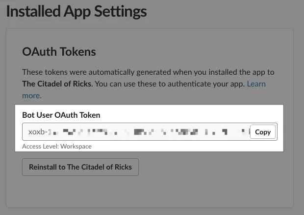 安裝完成後回到 Install App 頁面就會出現 Slack App Bot User OAuth Token ,點擊「Copy」複製, 記下來,稍後設定使用 。