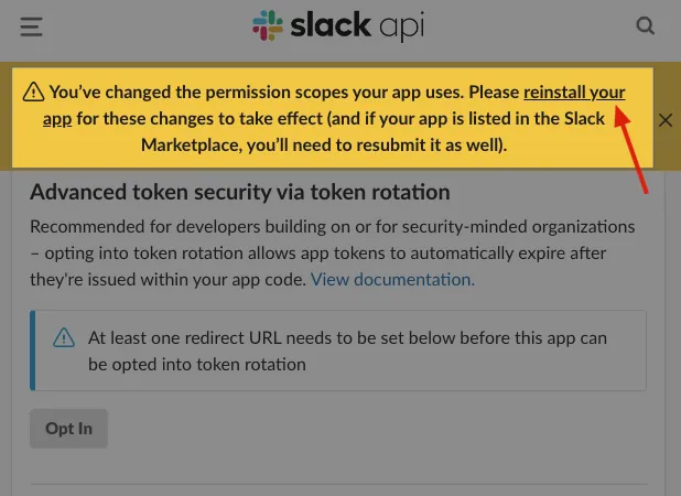 如果 OAuth & Permissions Scopes 有新增需要點擊「reinstall your app」重新安裝才會生效: