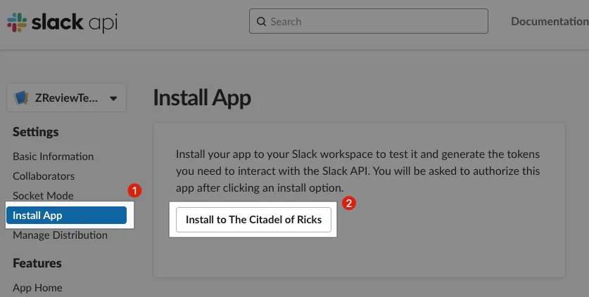 Install App 回到 Install App 頁籤安裝 Slack App 到 Workspace。
